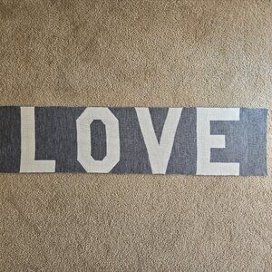 Grey knit scarf from Rebecca Minkoff in like new condition--no damage, no pilling, no wear, no pet hair, no odors. The fabric content tag has been removed, but it's a wool/acrylic blend. Grey reverses to white and says "LOVE LOVE".