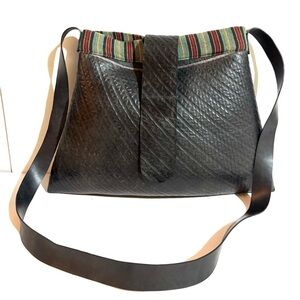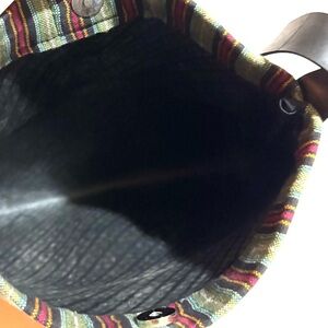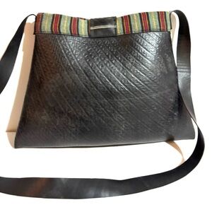 This elegant black bag is perfect for any occasion. Its sleek design and high-quality material make it a must-have accessory. The bag features a stylish strap and a unique textured finish. Made out of old tires handmade in Nepal by local women lining & exterior have some stains hight 11” wide 12” strap drop 20”