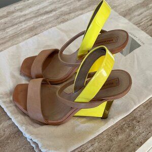Very cool heeled sandals from Reed Krakoff. The color and style will make a statement! Pre-loved condition, see pictures. European size 36.5. Made in Italy. Priced to sell. Come with a dustbag. Yellow and beige color with gold accent at the back of the heel. 4.5-5" heels.