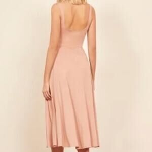 This is a beautiful Reformation blush pink dress. It's a fit and flare style with a midi length and scoop neck. The dress is a tank style, soft stretch jersey knit. It's perfect for a special occasion or just a fun day out. Don't miss out on this beautiful dress!