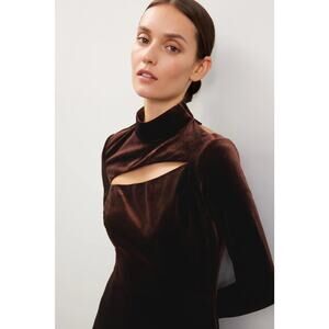 Brown velvet (100% Polyester). A-line. Long sleeves. Mock neck. Back zipper closure. 50" from shoulder to hemline. 17" slit.