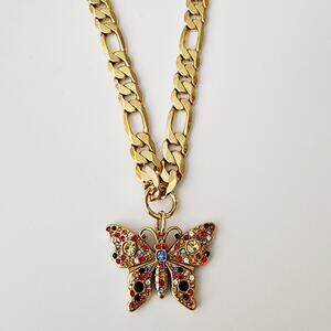 Stunning one of a kind Gucci butterfly pendant with multiple gemstones on premium 18K gold plated chunky figaro chain with lobster clasp.