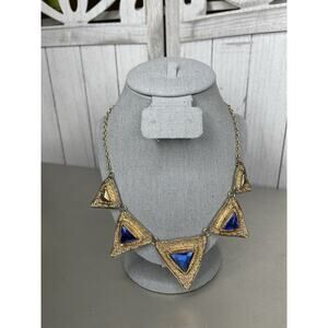 Retro 80s 90s Triangle Bib Statement Gold Tone & Blue Gem Necklace Vintage
