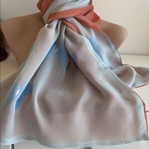 Reversible blue/coral brick butterfly very sheer silk chiffon scarf 22" x 66"