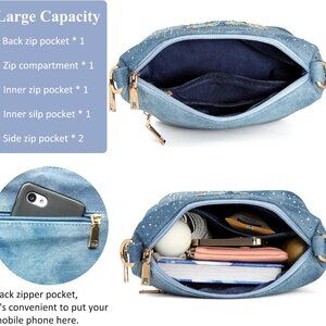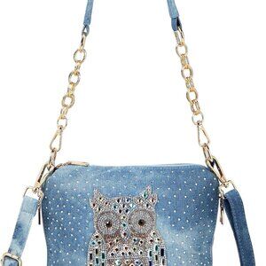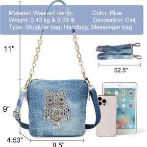 Features: Stylish denim clutch featuring a large main compartment, multiple interior pockets, and exterior slots to keep your essentials organized. Adorned with shimmering rhinestones for a touch of glamour. Includes an adjustable, padded shoulder strap for comfortable, hands-free carrying.