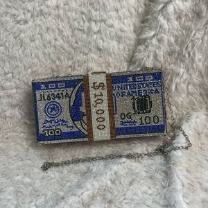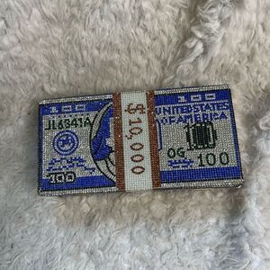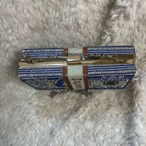 Rhinestones , Royal blue ,black and rose gold Dollar Frame clutch.clap top closure . Black fabric inside lining .see all pictures any questions please message.