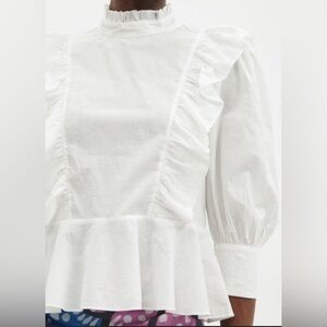Sylvie blouse, framed by undulating ruffles across the shoulders and bodice. It's made from crisp cotton poplin with a stand collar, cropped sleeves and peplum hem that balances the voluminous silhouette.
