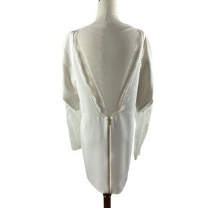 Rime Arodak’s loose fit Miss Jagger Dress is perfect for brides who want to look modern, but still feminine. The elegant lace panel sleeves are cut to be very feminine, mesh back panel with lace trim, gold half zip on back bottom, lined