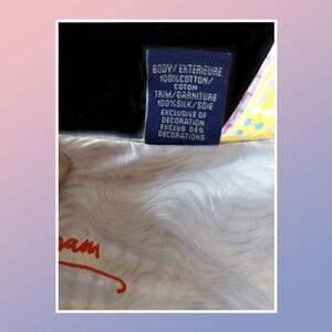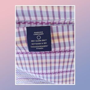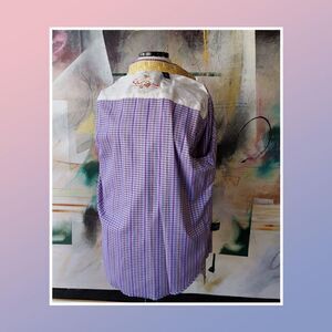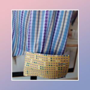 Robert Graham vintage handcrafted long sleeved button down shirt. Stripes of purple, yellow, blue. Knowledge Wisdom Truth on box plate. Under cuff and collar stand is pattern of yellow with blue, purple and cream polka dots. Robert Graham embroidered in compensation label. RG embroidered on the left sleeve placket. Size L. Made in India. Body: 100% cotton Trim: 100% silk.