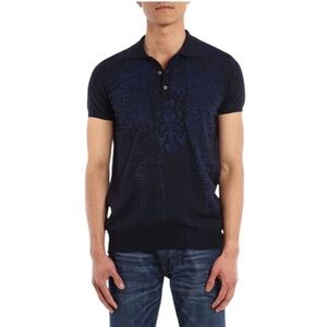 Roberto Cavalli Polo Shirt 100% Wool Knit Navy Blue Snake Print Mens Medium