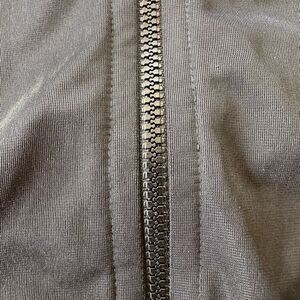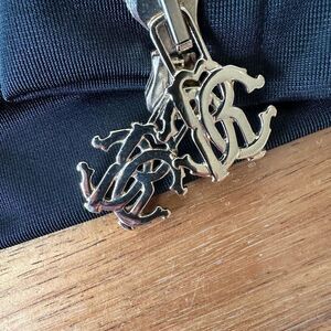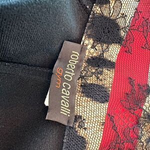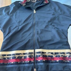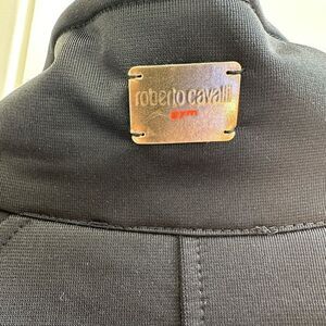 Roberto Cavalli Gym black, red and gold zipper jacket with three-quarter sleeves. I can’t recall if the sleeve length was as it is originally or if I professionally shortened the sleeves. The zipper detail is beautiful. The sleeve length is 23 inches, the length is 28 inches, the waist is 40 inches, and the bust measures 42 inches. Wonderful condition. Fits like a size large but there’s no size tag attached.