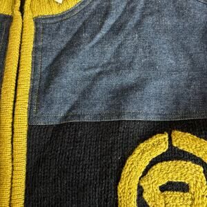 Step back into the iconic era with this vintage Roca Wear wool zip sweater! A true deadstock find from the y2k and 90s hip hop scene. 100% wool with denim trim and denim elbow patches, full double zipper front, zip side pockets, with slip pocket located on the backside of the sweater. Two tone green and blue, beautiful thick embroidery, logo details, ribbed cuffs and collar. Men's size XL in excellent condition.