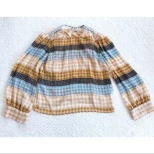 Roller Rabbit blue orange black hounds tooth print chiffon popover blouse top. Top has a round neck and long sleeves with button cuffs. The top is semi sheer so it has an attached cream tank underneath. Top is a woman's size small.