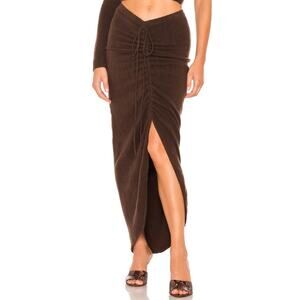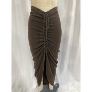 Ronny Kobo 'Zuna' Brown Ruched Knit Maxi Skirt Size XS: unlined, front drawstring closure with ruched fabric detail, leg slit, lightweight knit fabric.