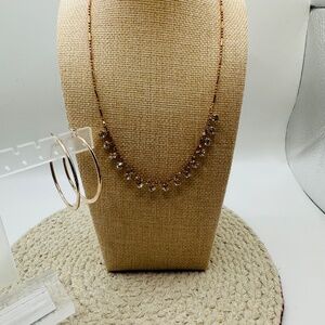 The necklace has clear rhinestones on it. They are all present and accounted for. The necklace would be great by itself or to be layered. All finding are rose gold tone. The hoop earrings have texture to them. What a great set!