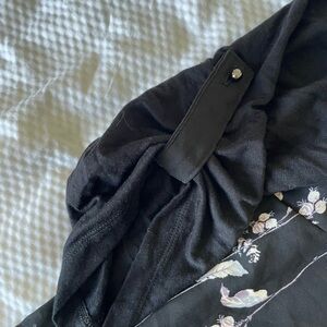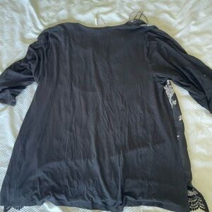 Chic black blouse with delicate floral pattern. Features elegant lace trim. Perfect for versatile styling.