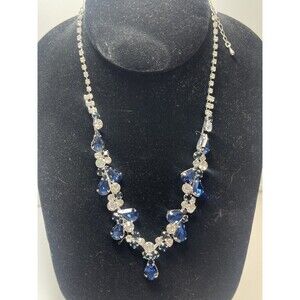 Four gorgeous jewelry pieces that coordinate with one another from designer Rosemarie Collections. Comes with two necklaces, one bracelet and one pair of earrings. All set in silver tone with clear and deep blue rhinestones. In excellent preowned condition. Comes in original box. Comes from a smoke free home.