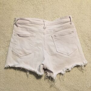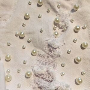 white with distressed front, high-rise,five pocket design with various sized pearls attached