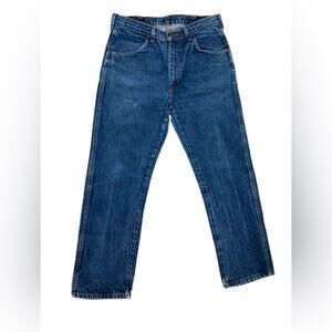 These Rustler straight jeans come in a classic blue wash with visible contrast stitching that adds to their timeless appeal. The denim fabric features subtle variations in color and texture, providing a slightly worn look while ensuring comfort with a regular fit.