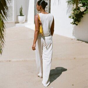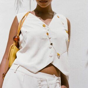 For our structure loving girlies! The Remi Top is made from a luxurious suiting fabric in a beige hue. It is a vest style featuring tank sleeves, V neckline, covered buttons at centre front and a pointed hem. Get the set with the Remi Pants! Designed exclusively by Sabo.