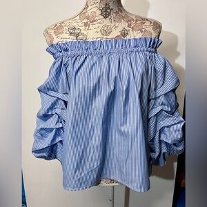 SADIE & LOVE Blue and white striped off shoulder ruffle top size M.