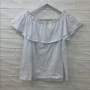 Cotton-blend off shoulder top with ruffled overlay. Off-the-shoulder neckline.