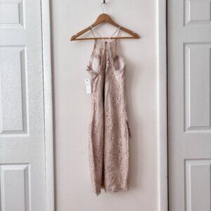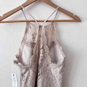 SAYLOR Lace Halter Mini Dress w/ Asymmetric Hem