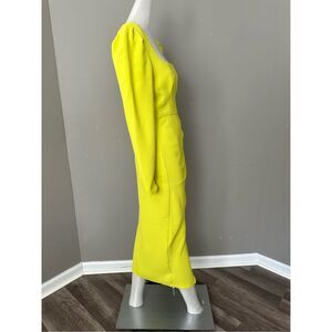 This Self-Portrait midi dress is made from heavy crêpe to achieve its elegant draping. The classic, puff sleeves and square neckline are balanced with a slit hem and fitted bodice.