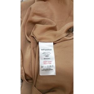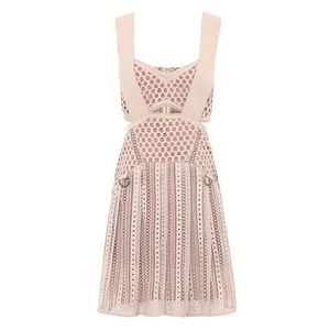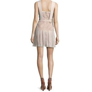 Honeycomb detail, frill skirt, cutout at waist, large shoulder straps, nude lining, and exposed back zip. Length ~33".