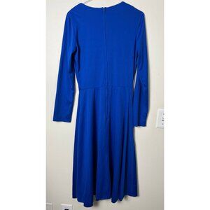 Style: The dress is a royal blue, long-sleeved, v-neck style with a draped, ruffled front.