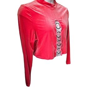 SHEIN CURV High Neck LongSleeve Cropped Pink Velvet Front Embellished O-Ring Top