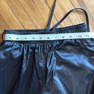 Sleek and shiny black track pants with an elastic waistband and drawstring. Perfect for casual wear or workouts.