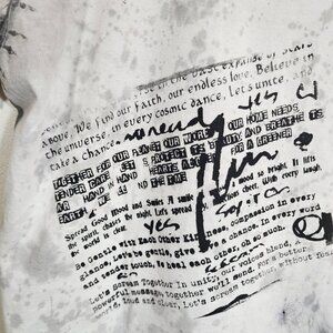 Hand-reworked and thoughtfully distressed, this unique tee is a wearable piece of art. Featuring hand-applied stain effects, custom smile appliqués, and bold black hearts—all crafted by me. Tiny embroidered pearls add a girly rock-and-roll edge, while silk-screened phrases bring a touch of political engagement. A truly one-of-a-kind piece, forever yours.