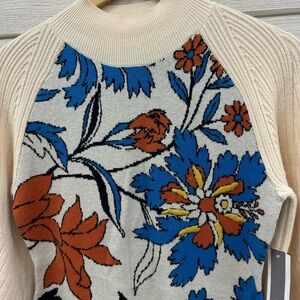 Stunning and statement-making, this Anthropologie sweater dress features bold floral embroidery in vibrant orange, blue, and yellow against a soft neutral knit backdrop. Puff ribbed sleeves, a mock neck, and a flattering fitted silhouette make this a cozy-meets-elegant option for fall through spring.