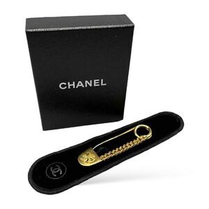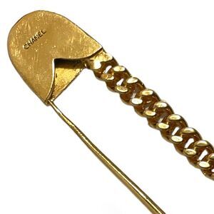 This vintage Chanel brooch is a clothes pin. Features a four leaf clover š & a chain-link design. Hallmark: "Chanel" stamped on the backside. Gold-toned hardware.