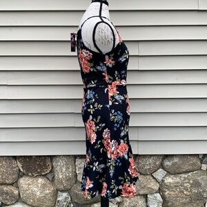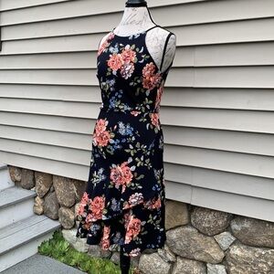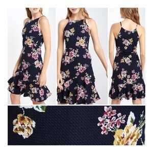 Navy Textured Floral with bottom Ruffled Detail Dress In a stretchy comfortable fabric and waistline gives a flattering look. Perfect from Work to a Wedding!