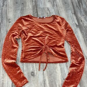 Chic rust velvet top with ruched front. Long sleeves for a stylish look.