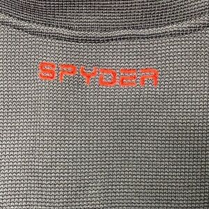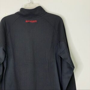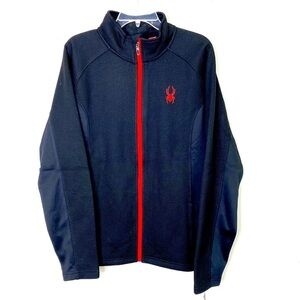 Spyder Men’s black jacketWith red trim and red spyder logo on the front and spyder Logo on the back with two front pockets 100% polyester. Size medium