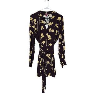 Chic black dress with bold yellow floral design. Long sleeves and wrap style. Perfect for stylish occasions.