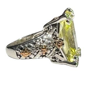 Sterling lime green multifaceted cut rectangle stone ring. Size 7. Marked 925. The band is shiny silver with goldtone flowers and a design of dots and crisscrosses. I don't know what the stones are - they may be semi precious or they may be crystal. The corners of the center stone have 3 bezel set darker green stones. One is missing. Otherwise in very good preowned condition.  The stone sits 3/8" high. The back band is 1/8" wide.
