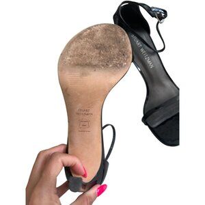 These elegant Stuart Weitzman black patent leather ankle strap heels are perfect for any occasion. Featuring a chic design and comfortable fit, these heels add sophistication to any outfit. 4" heel.
