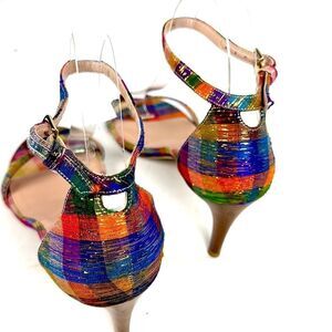 STUART WEITZMAN Metallic Rainbow Plaid Leather Ankle Strap Nunaked Sandals 9,5