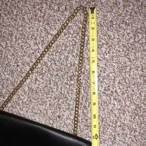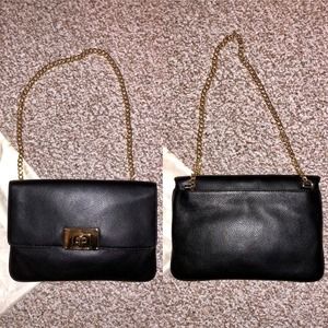 Beautiful soft black leather construction with gold hardware. Gold chain Strap tucks away in the back pocket to turn this bag into a clutch. Front gold buckle turns for locked closure. Interior credit card and ID slots. Comes with dust bag. In great condition- only wore one time for a wedding. Coming from a clean and smoke-free home. See photos for measurements.