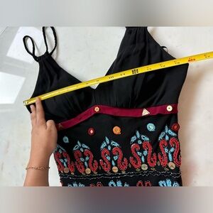Make a statement of style and elegance with this Sue Wong Nocturne vintage boho silk dress. The dress features a turquoise beaded pattern with a sleeveless spaghetti strap neckline that adds a touch of sophistication to your look. This dress is perfect for any occasion, be it a casual outing with friends or a formal event. The dress is made from 100% silk and is designed with a fit and flare style that flatters your figure. The beaded accents on the dress add a touch of glamour that makes it perfect for a party or cocktail event. The dress is beaded in turquoise and coral beads, knee length, making it perfect for rodeo, just add some boots or Strappy sandals for evening out / club wear. Get this dress now and add a touch of bohemian western style to your wardrobe.