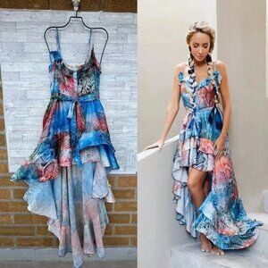 O. Retail $250 sold out at website. Runs small . Bring some glitz to your life with this high to low tiered maxi dress featured with a ruffled hem and pearl buttons detailing on the front maintains a casual look while still feeling like you got dressed up.in very good condition