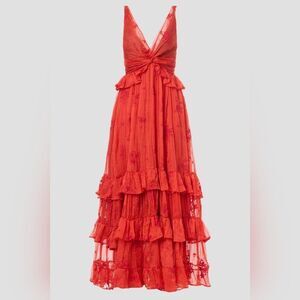 Red gown (Ground 100% Polyester, Embroidery 100% Cotton). V-neck. Back zipper closure. See size & fit notes for length and measurements. Imported.