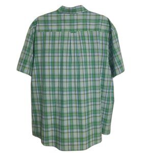 Men's green casual, button-down, short sleeve shirt by Saddlebred, size XXL.  Shirt has a vibrant plaid pattern. Perfect for everyday wear.  Includes a left chest pocket.   Fabric blend of cotton and polyester.  Excellent pre-owned condition; no flaws.