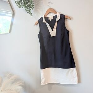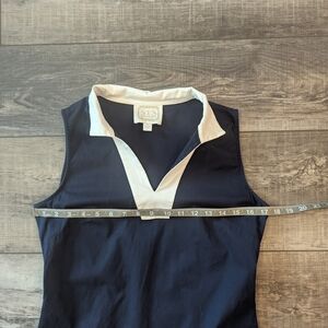 Elegant navy dress with white accents. Sleeveless design. Perfect for any occasion. size xs. excellent pre-loved condition no flaws. measurements in photos. a4