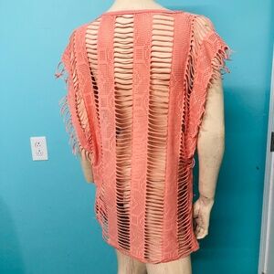 Salmon See Thru Slices & Fringe Pullover Sleeveless Tunic Top/Swimwear Cover~L