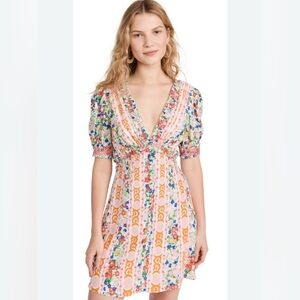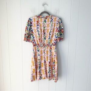 This is a SALONI Lea mini dress in size 2 with a vibrant floral print on white, orange, and pink crepe fabric. It features a V-neckline, short puff sleeves with ruffle accents, a smocked waist, and a zip closure. The dress has a bohemian and preppy style, perfect for parties or casual wear in the summer or spring season.